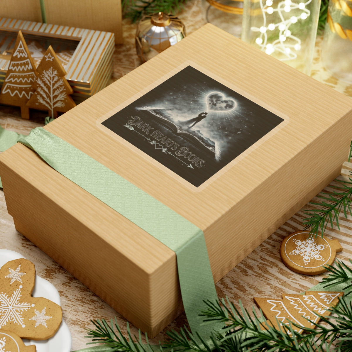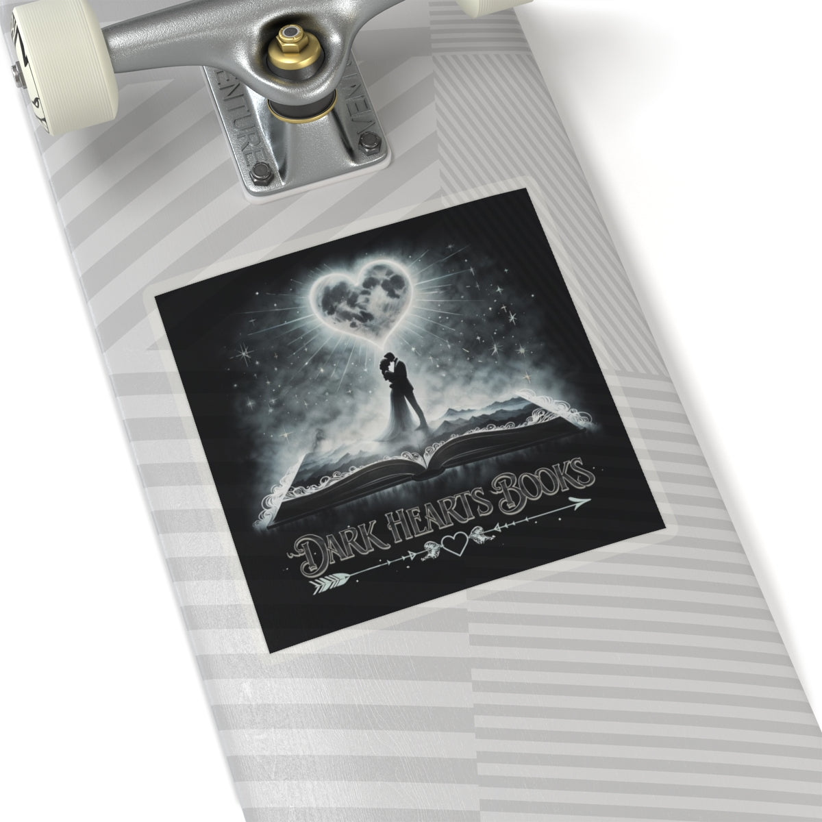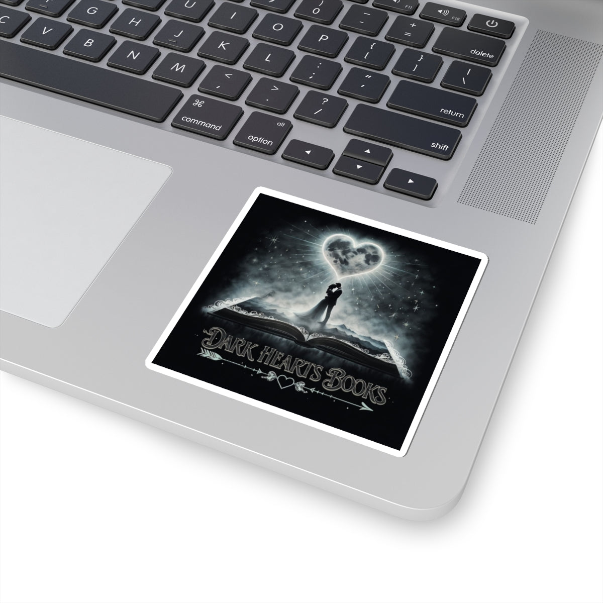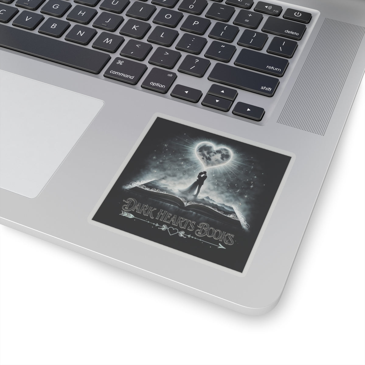 Enchanting sticker featuring a silhouetted couple sharing a romantic moment under a glowing heart-shaped moon, surrounded by a celestial night sky and an open book adorned with intricate details. Perfect for book lovers, dreamers, and fans of dark romance