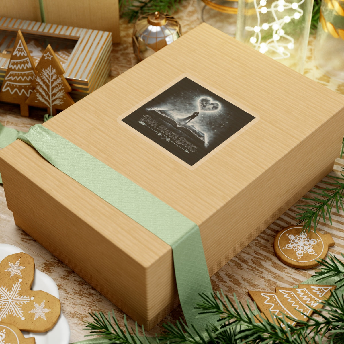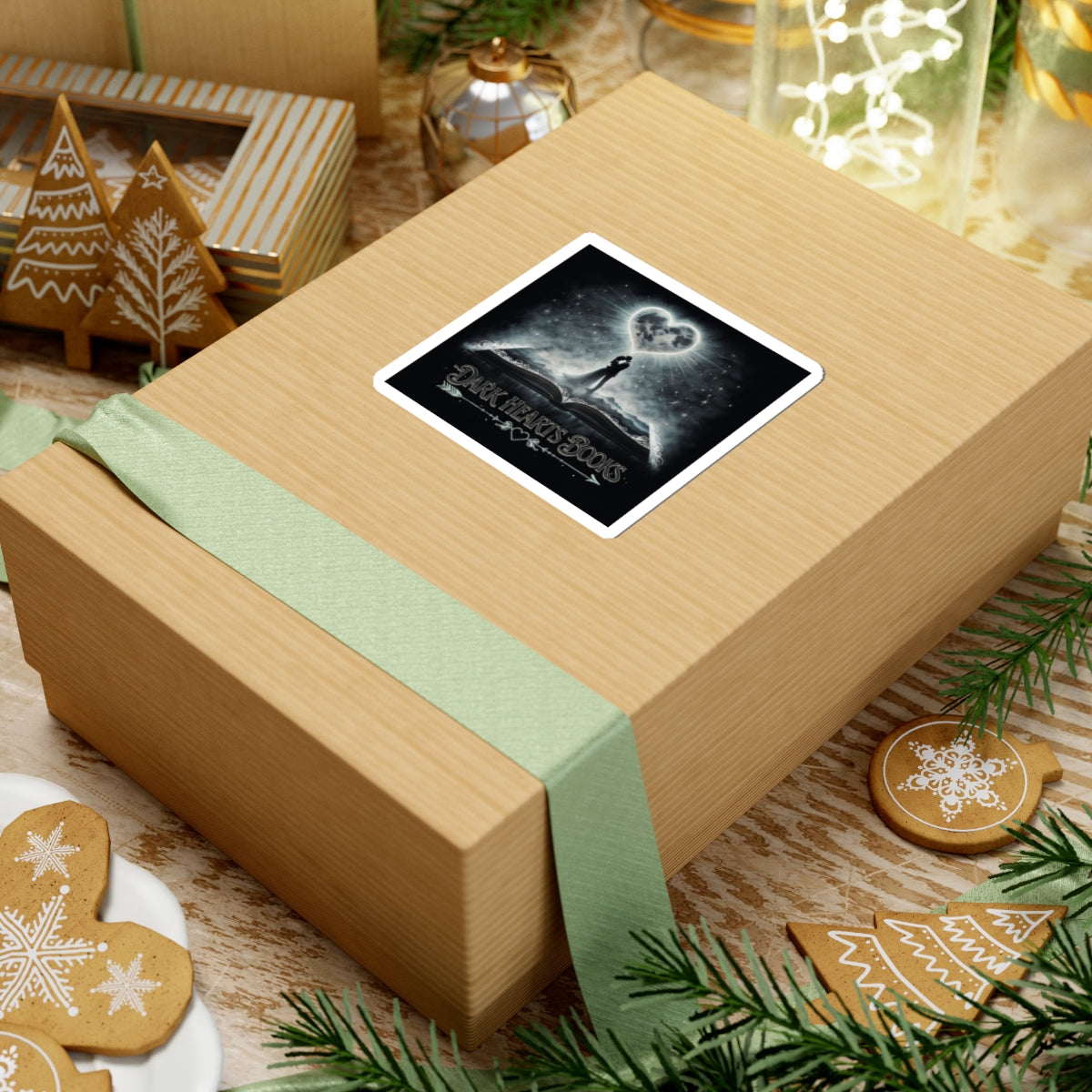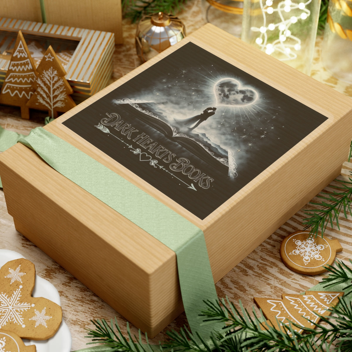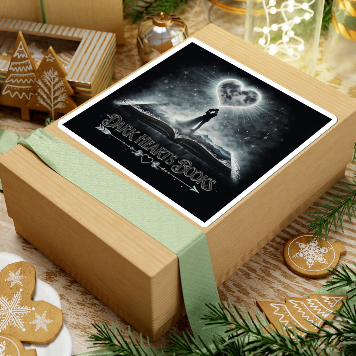 Enchanting sticker featuring a silhouetted couple sharing a romantic moment under a glowing heart-shaped moon, surrounded by a celestial night sky and an open book adorned with intricate details. Perfect for book lovers, dreamers, and fans of dark romance