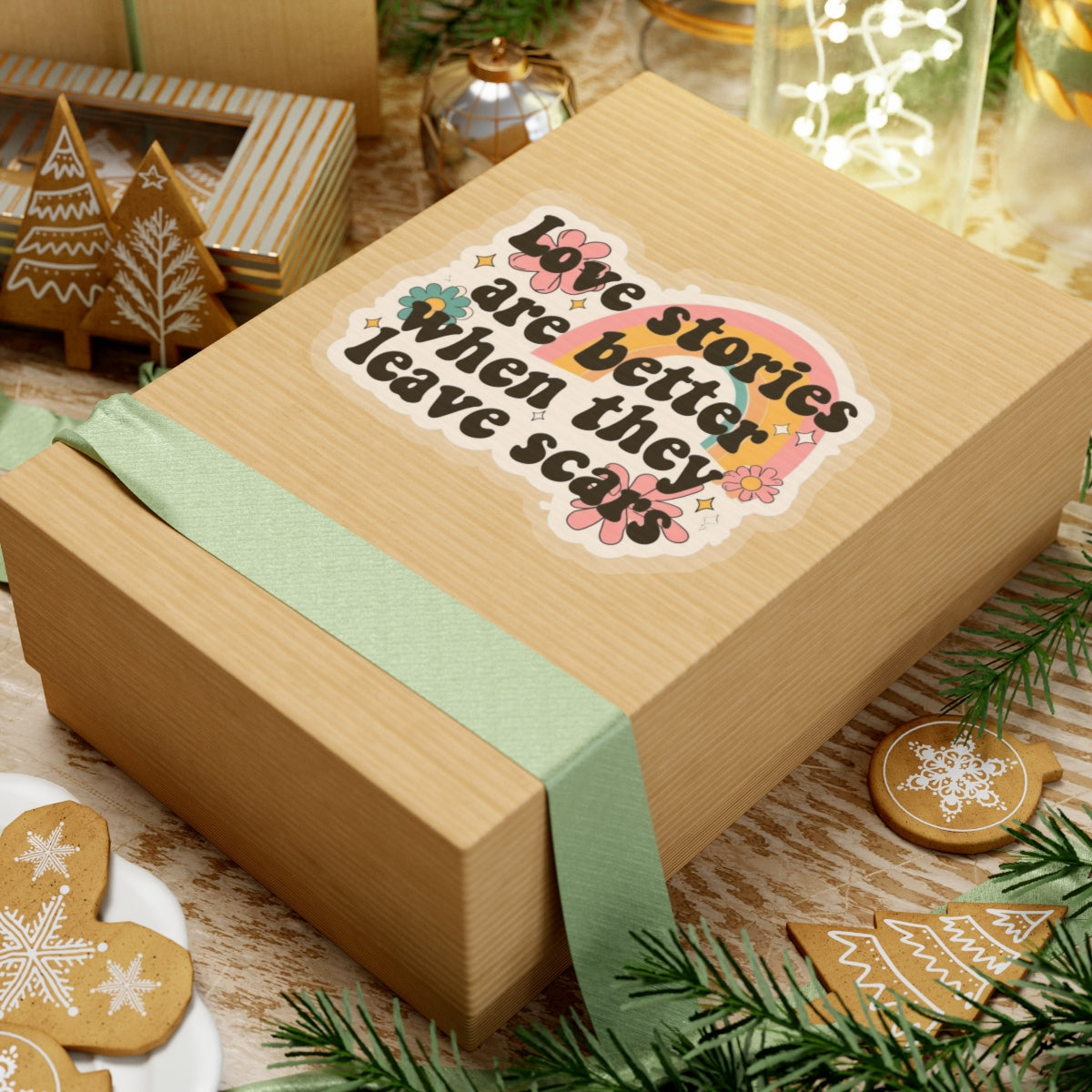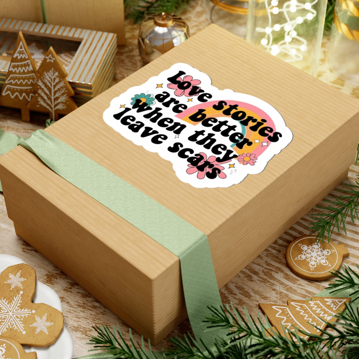 Add a touch of retro flair to your belongings with this unique sticker that celebrates the beauty and pain of unforgettable love stories. Featuring the bold, phrase "Love Stories Are Better When They Leave Scars," this design combines vibrant rainbows, whimsical flowers, and sparkling accents for a truly eye-catching aesthetic.